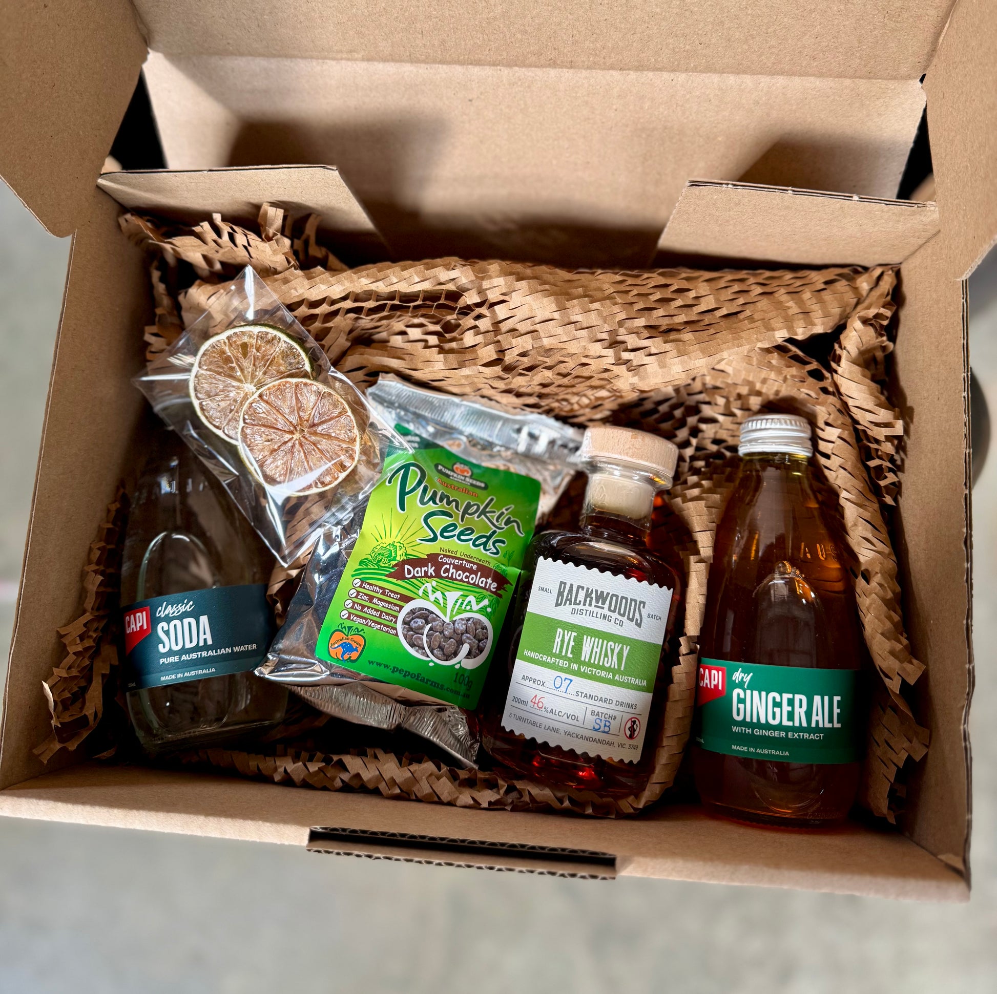 Bold, spicy and distinctly Australian, our Rye Whisky takes centre stage in this gift set. Matched with premium mixers and a local snack, it’s an easy way to enjoy a rye highball or sip it neat. Whether you’re gifting to a whisky fan or treating yourself, this box is the perfect introduction to our award-winning rye.